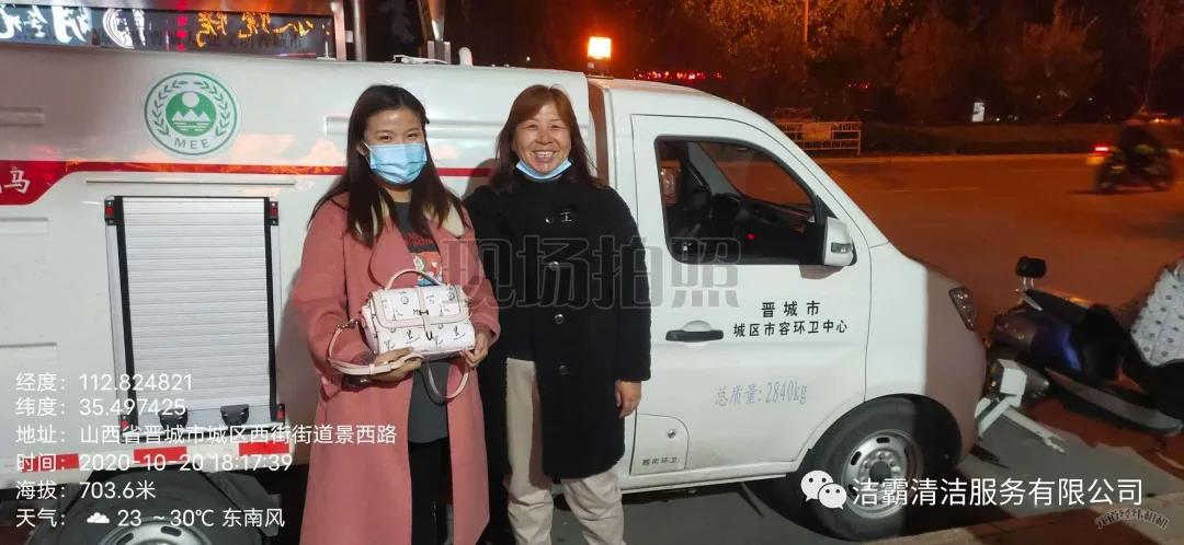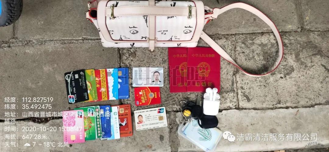 10月20日下午3點左右,晉城市潔霸清潔服務(wù)股份有限公司保潔部環(huán)衛(wèi)經(jīng)理李通和工人在城區(qū)南街街道景西路段進行街道清洗作業(yè)時,忽然看見晉城農(nóng)商銀行門前的綠化帶里有一個女士挎包,忙叫環(huán)衛(wèi)工人郭志云把挎包撿了起來。當時就考慮到失主丟失挎包以后一定很著急,在同事的共同見證下他們打開挎包,經(jīng)過查看,發(fā)現(xiàn)挎包內(nèi)有一張王女士的身份證、社?般y行卡數(shù)張,還有結(jié)婚證、鑰匙、耳機、富士康工牌等物品。憑借富士康工牌上的工號,他們給富士康打電話聯(lián)系到了失主,后由環(huán)衛(wèi)主管秦彩鳳將挎包交到失主手中。收到失而復(fù)得的挎包,王女士又驚又喜,感激萬分。