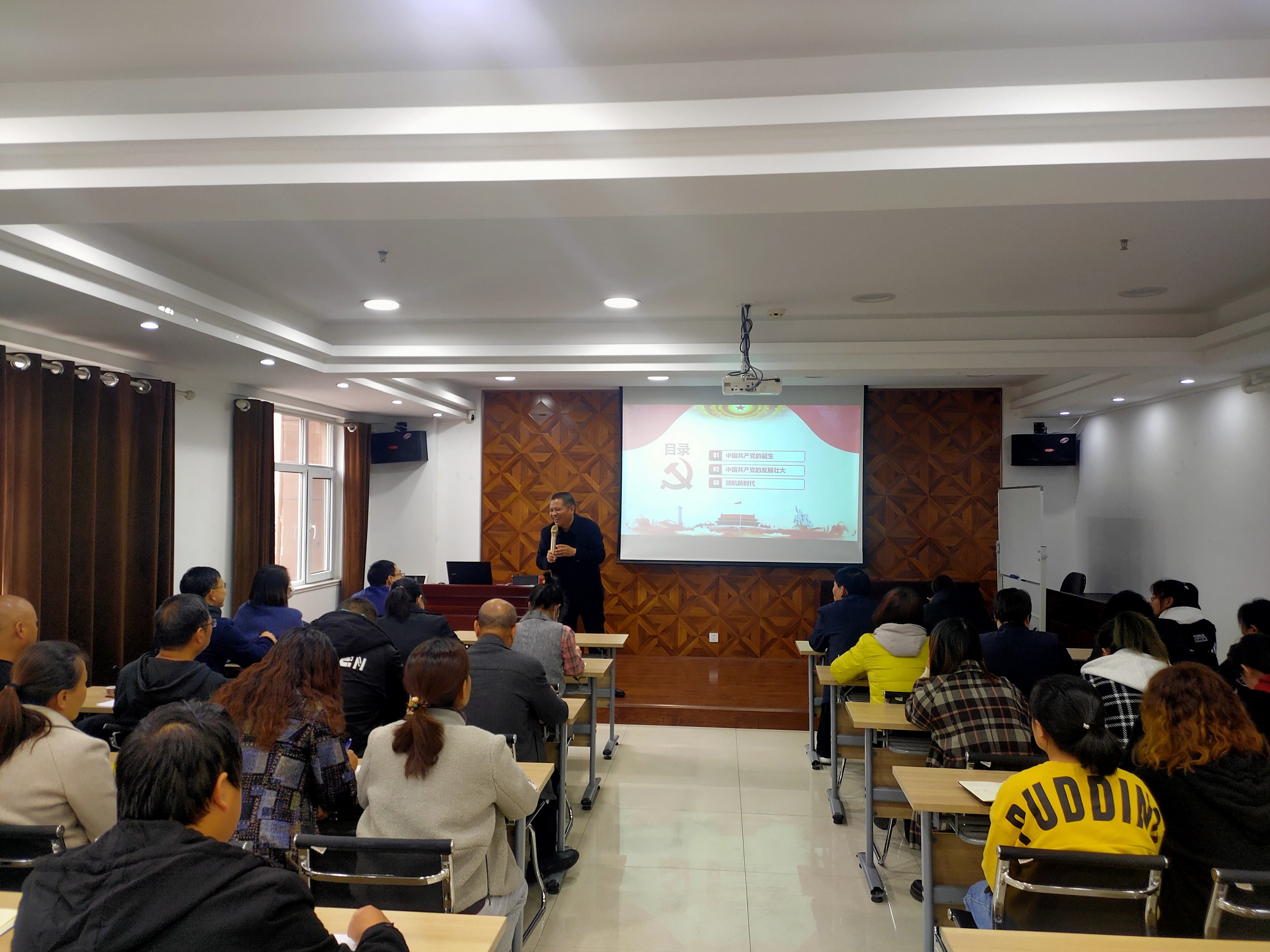 黨課中,苗祥記校長(zhǎng)以“沒(méi)有共產(chǎn)黨就沒(méi)有我們今天的幸福生活”為主題,從1901年清政府簽訂喪權(quán)辱國(guó)的《辛丑條約》講起,引用大量翔實(shí)、生動(dòng)的歷史資料,對(duì)“十月革命”、中國(guó)共產(chǎn)黨的誕生、創(chuàng)建井岡山革命根據(jù)地、遵義會(huì)議、中共中央在延安、中共七大、中共建設(shè)社會(huì)主義的偉大成就等歷史場(chǎng)景為大家作了系統(tǒng)全面的講解,全景式展現(xiàn)了中國(guó)共產(chǎn)黨的誕生、歷經(jīng)淬煉而逐步發(fā)展、成熟、壯大以及領(lǐng)航新時(shí)代的的偉大歷程,闡述了中國(guó)共產(chǎn)黨的初心、使命和宗旨,讓與會(huì)人員更直觀更深刻認(rèn)識(shí)到?jīng)]有共產(chǎn)黨就沒(méi)有我們今天的幸福生活,經(jīng)受了一次深刻的紅色文化洗禮。