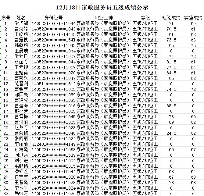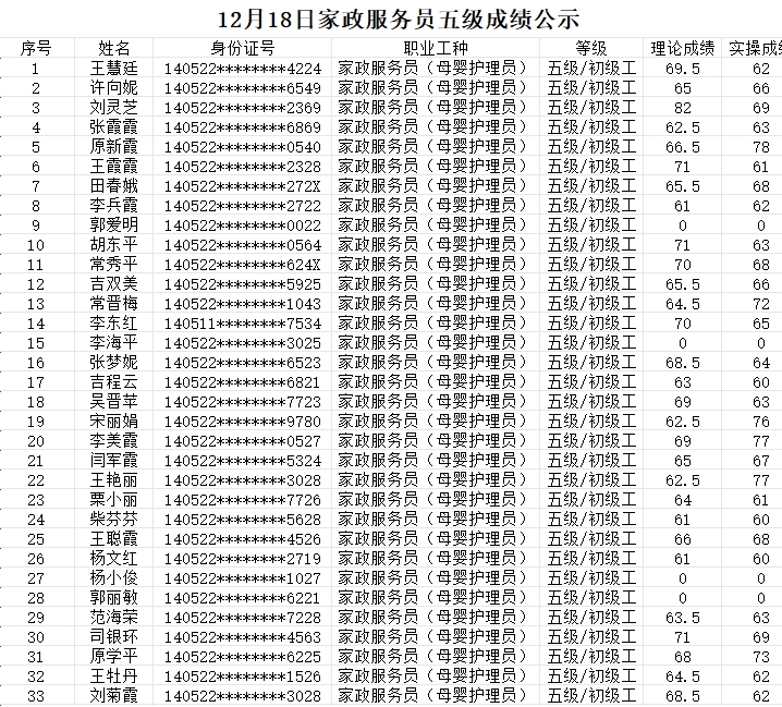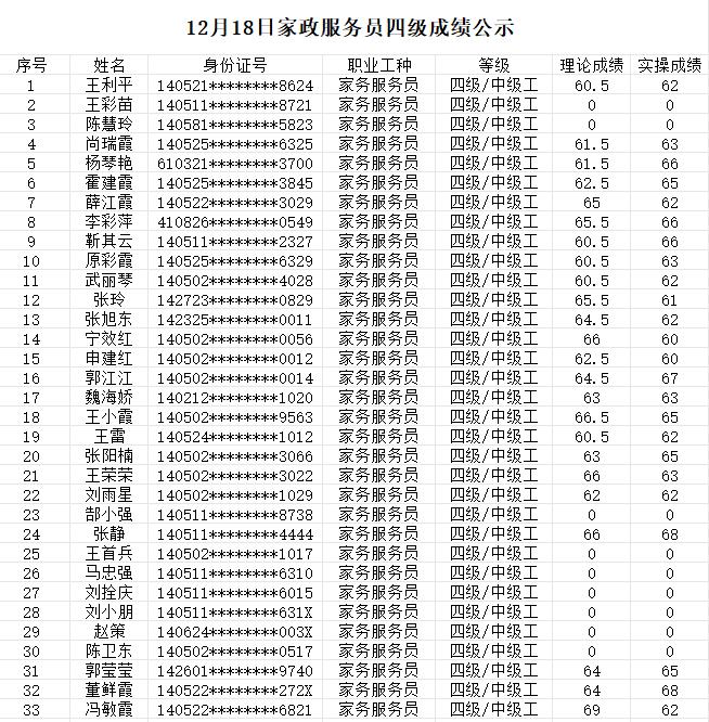 晉城市潔霸清潔服務(wù)股份有限公司職業(yè)技能等級認(rèn)定中心現(xiàn)將2023年12月18日認(rèn)定人員成績公示如下: