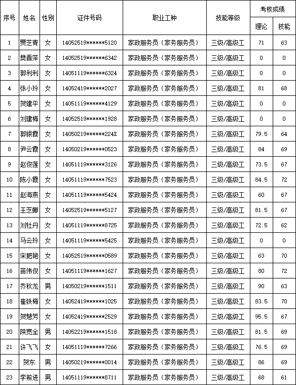 山西潔霸清潔服務集團股份有限公司職業(yè)技能等級認定中心2025年8月30日第1批家政服務員(家務服務員)高級認定人員成績公示