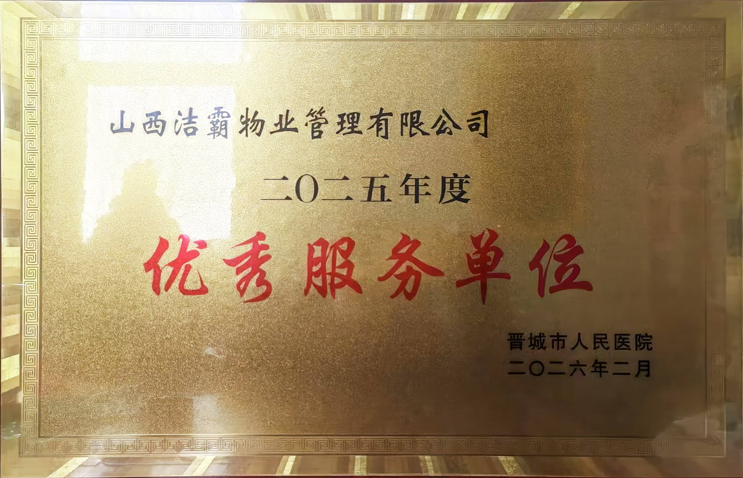 2月8日下午,晉城市人民醫(yī)院隆重召開(kāi)第三屆職工代表大會(huì)第五次會(huì)議暨2026年工作會(huì)議,全面總結(jié)2025年發(fā)展成果,系統(tǒng)部署2026年重點(diǎn)任務(wù),并對(duì)為醫(yī)院發(fā)展做出突出貢獻(xiàn)的先進(jìn)集體與個(gè)人進(jìn)行表彰。山西潔霸物業(yè)管理有限公司憑借優(yōu)質(zhì)服務(wù)表現(xiàn),榮獲晉城市人民醫(yī)院2025年度“優(yōu)秀服務(wù)單位”稱(chēng)號(hào)。